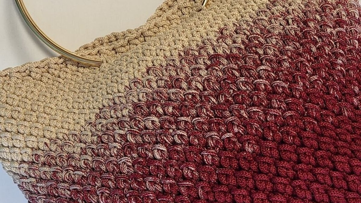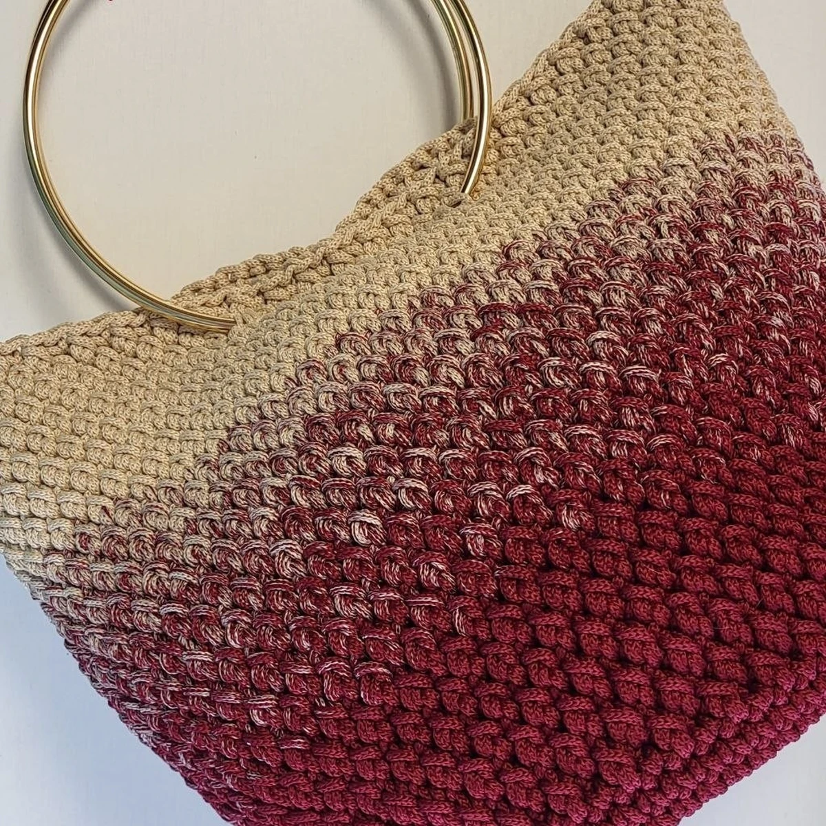 Эффектная сумка-«шоппер» с металлическими круглыми ручками и выразительной фактурой — тот самый аксессуар, который выглядит дороже своей пряжи. Плотное полотно держит форму, а переход от тёплого бежевого к насыщенному бордо создаёт красивый градиент и глубину. Рельефный узор читается чётко, прибавки/убавки визуально аккуратные, верх оформлен ровно — сумка выглядит собранно и готовой к носке хоть каждый день, хоть как акцент к однотонному образу.