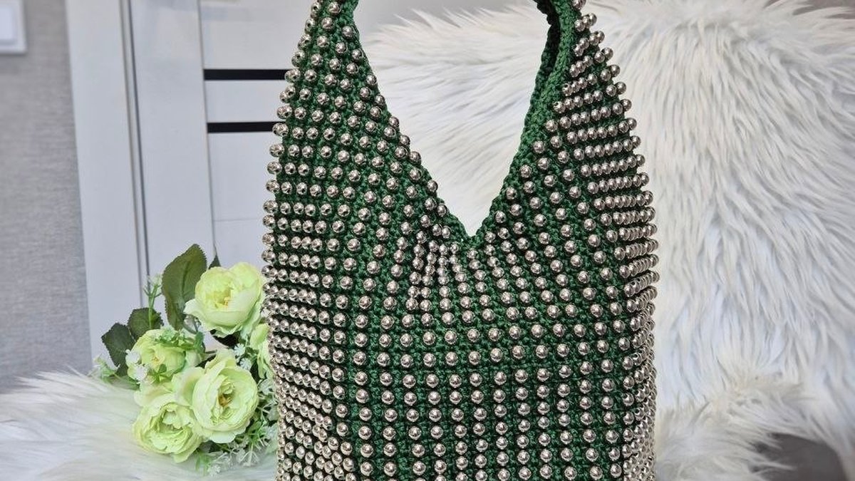 Эффектная сумка-«хобо» глубокого изумрудного оттенка, полностью усыпанная металлическими бусинами — вещь с ярким вечерним характером и отличной посадкой по форме. Полотно плотное, держит объём, ручка аккуратно выведена без явных перекосов. Бусины уложены ровной «сеткой», за счёт чего поверхность выглядит как ювелирная кольчуга. Сочетание зелёного и холодного серебра работает очень выигрышно: аксессуар выглядит дороже своей себестоимости и точно притягивает взгляд.