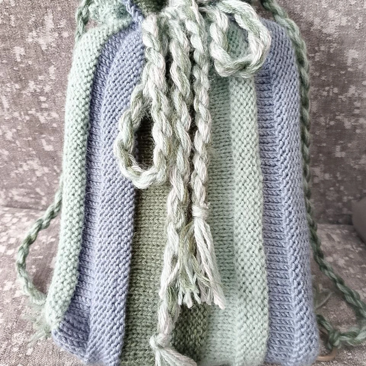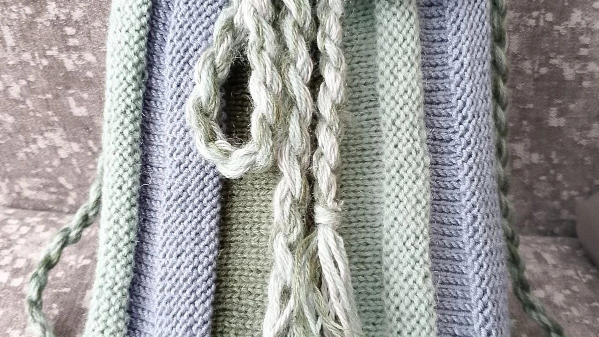 Уютный вязаный мешочек-кисет в спокойной шалфейно‑серой гамме — практичная вещь для хранения мелочей, пряжи в дороге или подарочной упаковки. Полотно выглядит плотным и держит форму, вертикальные цветовые блоки добавляют графичности, а кулиска со шнуром аккуратно собирает верх без лишнего объёма. Шнур эффектно смотрится в скрутке и хорошо поддерживает стиль изделия. В целом работа аккуратная и «чистая», но в отделке можно довести до более магазинного уровня — особенно в зоне шнура и верхнего края.