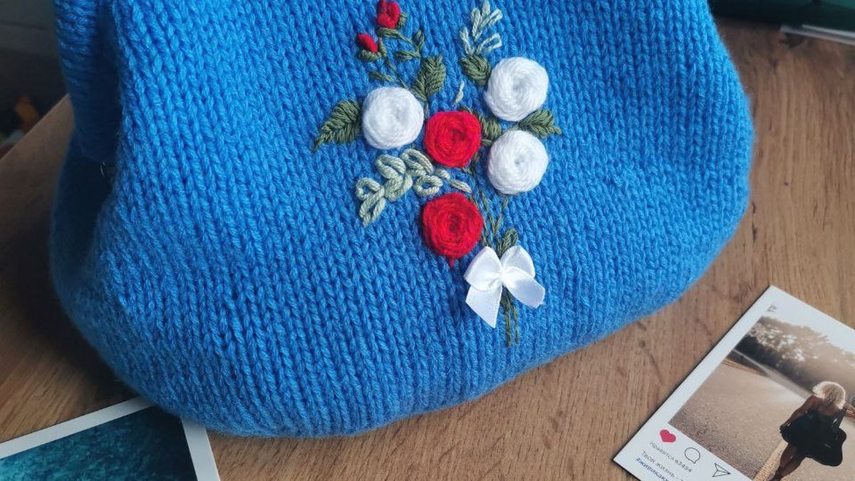 Эта сумочка выполнена в технике вязания спицами с применением лицевых петель, что обеспечивает гладкую и ровную текстуру. Основной полотно связано в лицевой глади, что придаёт изделию аккуратный и законченный вид. Важнейшим элементом декора является вышивка, выполненная вручную с использованием различных стежков, например, французский узелок для создания цветочных мотивов. Работа с цветами требует внимательности и точности, так как каждый элемент вышивки становится центральным акцентом сумочки. Для создания сумки использовалась техника кругового вязания, что позволило избежать швов и создало аккуратную форму. В верхней части предусмотрено небольшое уплотнение, что позволяет ей сохранять форму и функциональность. Такой подход подчёркивает ваше мастерство в работе как с вязанием, так и с декором, демонстрируя ваше желание экспериментировать и создавать уникальные аксессуары.