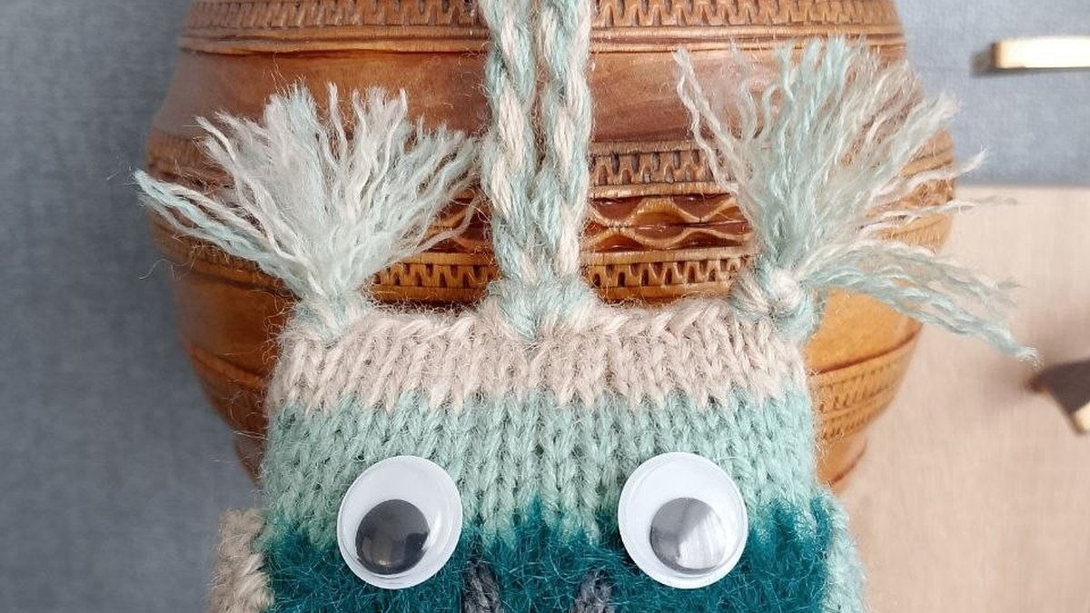 Очаровательный мини-мешочек в образе совушки — милый аксессуар, который хочется рассматривать. Полотно связано лицевой гладью с полосатым градиентом в мятно-бирюзовой гамме, сверху — кулиска/край с аккуратной стяжкой, а подвес выполнен в виде шнура (похоже на айкорд или плотный шнурок). Пластиковые «бегающие» глазки добавляют характер, клюв вышит тёмной нитью. Кисточки по бокам удачно поддерживают игрушечный стиль и делают вещь более живой.
