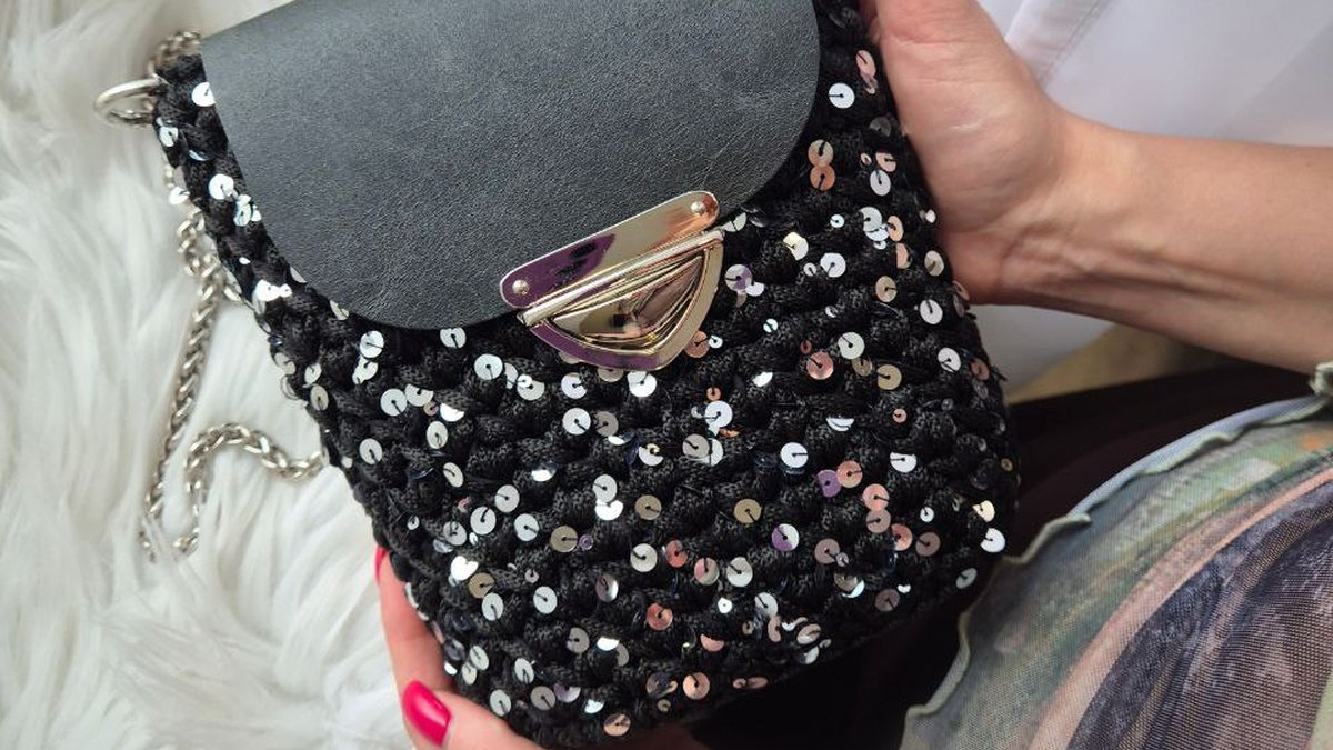 Замечательная вязаная сумочка завершается элегантного вида клапаном, усовершенствовавшим дизайн яркими пайетками. Это идеально подходит для вечернего выхода, добавляя блеска и изысканности. Основной цвет — чёрный, пайетки отражают разные оттенки света, создавая переливающийся эффект. Прочная ручка-цепочка добавляет аксессуару изящества и практичности.