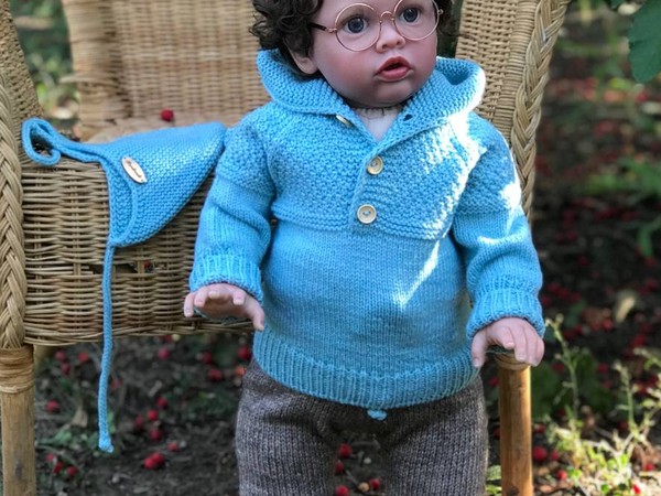 Очаровательный комплект для малыша состоит из бирюзового худи-свитера с капюшоном и планкой на деревянных пуговках, серо-меланжевых брючек с эластичной отворотной манжетой и вязаной шапочки-капора в тон свитеру. Верхняя часть худи выполнена жемчужной вязкой, создающей рельефную «зернистую» фактуру, а основное полотно — гладкая лицевая гладь, благодаря чему изделие выглядит аккуратно и современно. Капюшон плавно переходит из кокетки, образуя мягкую линию и отлично сидит на голове куклы/малыша. Брючки связаны резинкой 2×2, что придаёт им комфортную посадку и лёгкое прилегание. Цветовая палитра — свежая бирюза в дуэте с тёплым серым — выглядит гармонично и подчёркивает детскую нежность.