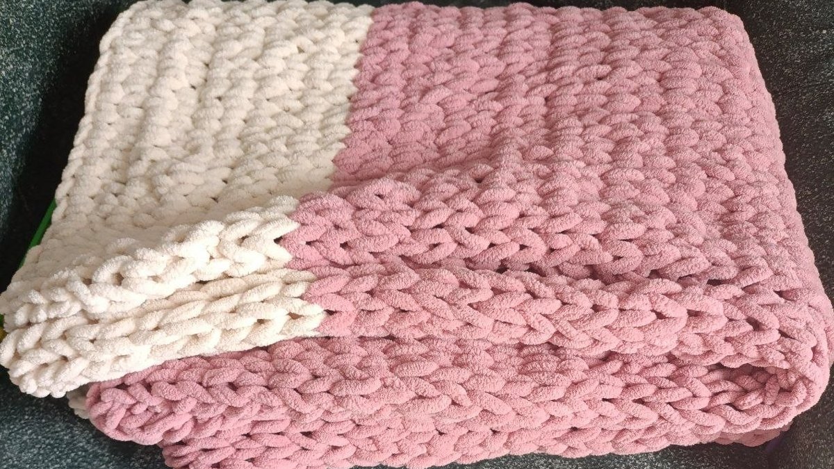 Крупная ручная вязка (возможна вязка на очень толстых спицах/руками) из плюшевой пряжи, полотно прямоугольное, колор-блок из двух цветов.