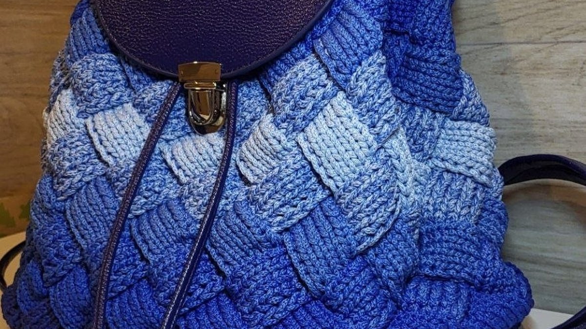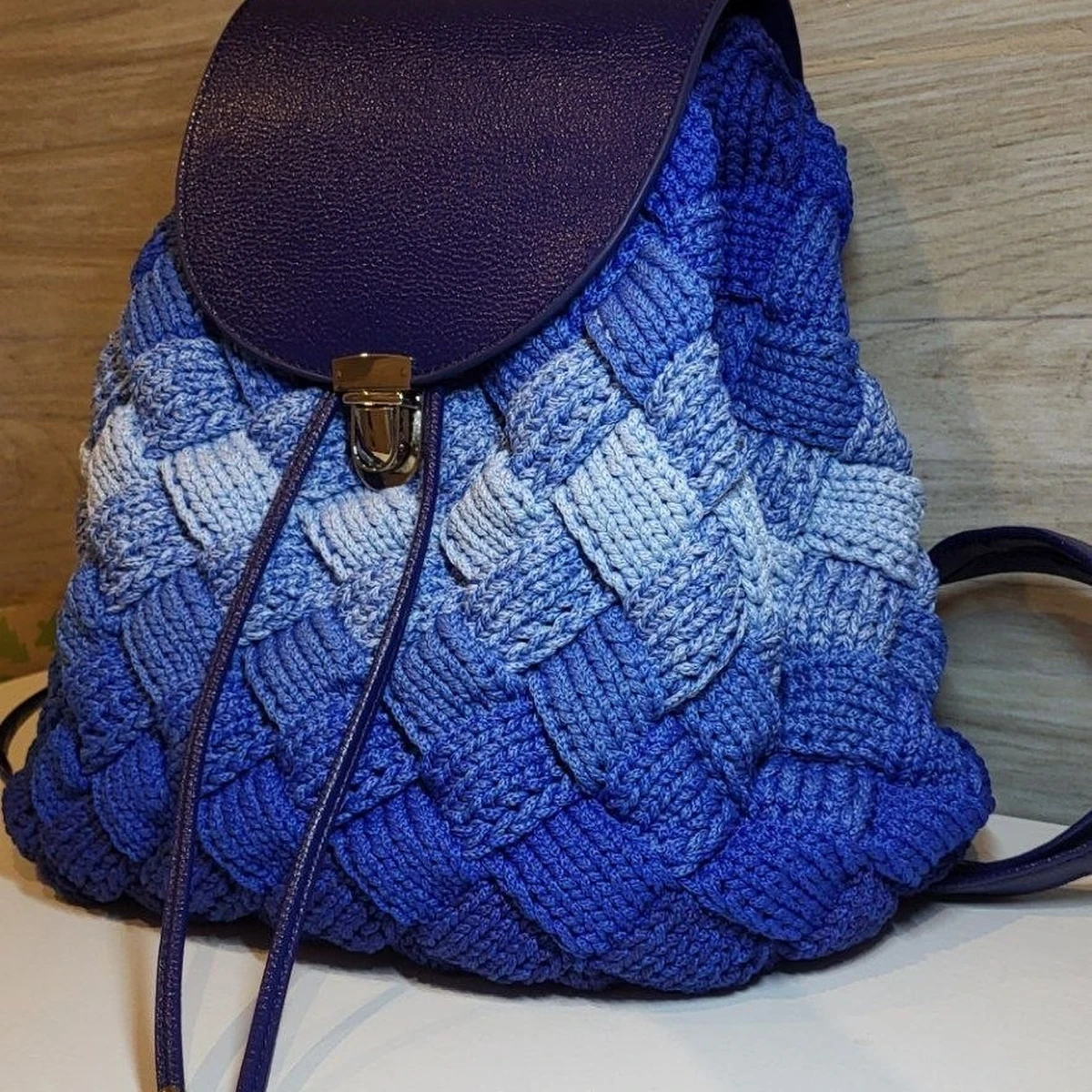 A stylish crochet backpack with a pronounced textured "braid" pattern that looks voluminous and "luxurious" due to its dense texture. A gradient from light blue to deep blue emphasizes the interlacing and adds depth. A leather flap and metal clasp neatly "finish" the look and make the item more durable. The overall work is tidy: the shape holds, the fabric is dense enough, and the texture reads clearly even on curves.