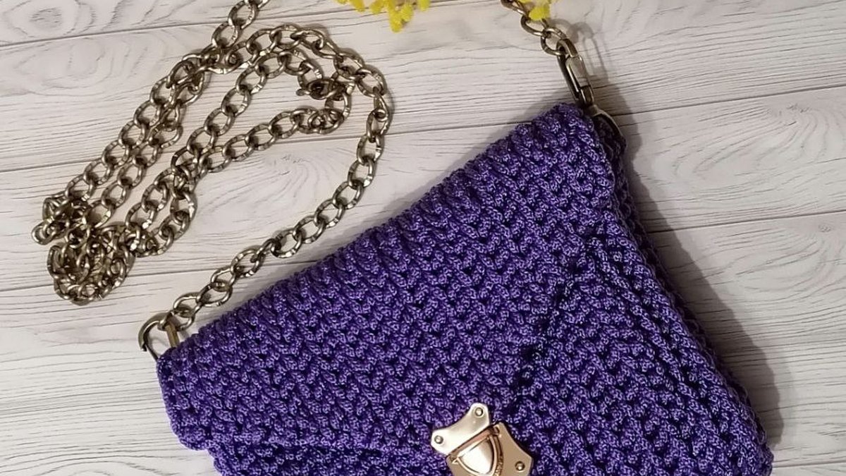 Эта изящная сумочка-конверт сразу привлекает взгляд глубоким фиалковым оттенком и выразительной текстурой «рисового» узора, выполненного крючком. Объёмные петельки создают плотное полотно, которое держит форму даже без жёсткого каркаса. Клапан аккуратно подчёркнут диагональной линией убавок и украшен элегантной металлизированной защёлкой в винтажном стиле, а массивная цепочка цвета старой бронзы придаёт модели чуть дерзкий городской характер. Сочетание блеска фурнитуры и сатинового отблеска шнура делает аксессуар универсальным как для дневного, так и для вечернего выхода.