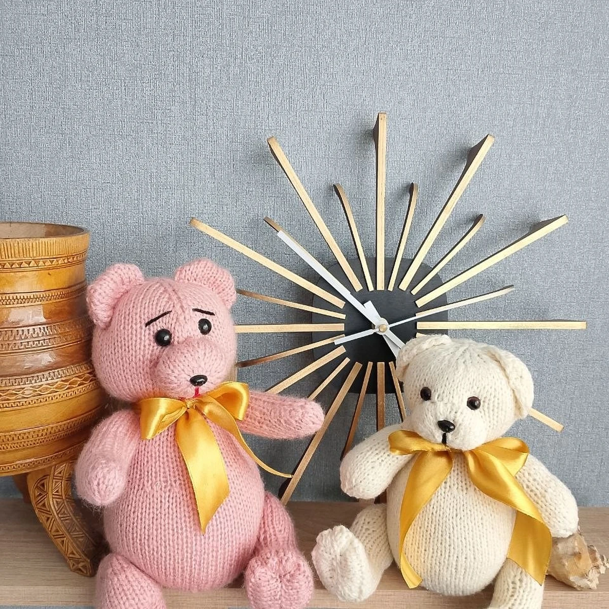 Toys are worked with knitting needles from medium-weight yarn; the main fabric is stockinette with shaping achieved by increases and decreases. Parts (head, body, arms/legs, ears) are knitted separately with smooth curves: increases are distributed in "wedges", decreases cinch the shape without sharp angles. For neatness in those areas it's better to use symmetrical decreases (k2tog or ssk) so the lines meet evenly. Assembly is done by sewing the stuffed parts together (hollowfiber/synthetic filling). To make seams as invisible as possible, mattress stitch along edge ladders and basting beforehand are optimal: pin parts along axes (top/bottom/middle), then sew with small stitches. The face is finished with safety eyes and embroidered nose/mouth in black thread; eyebrows are embroidered with separate stitches — marking for symmetry is especially important here. Decoration — satin ribbons tied into bows. This accent supports the gift style well; to prevent the ribbon from slipping, catch it with a couple of hidden stitches at the knot. If you want to increase complexity and raise the level of finish — add face tucks, contrasting inner ear/foot pads, or textured elements (garter stitch strips, ribbing, boucle inserts).