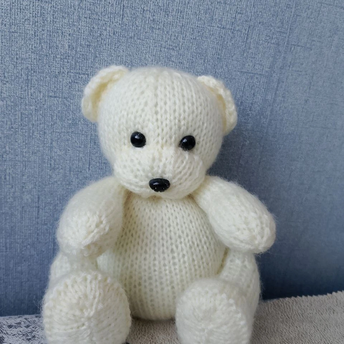 A gentle “creamy” teddy — soft, kind, and very gift‑worthy. The toy is knitted with needles in stockinette stitch with separate pieces (head, body, legs, ears) and seamed together; the seated pose works well and the proportions are clear. Plastic eyes and nose give a neat facial expression, but because the fabric is fairly loose the surface looks slightly “meshy,” and tension differences are noticeable at bends. Photos are clean and clear, the background is calm, the toy is shown frontally and is easy to see.
