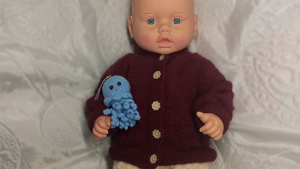 Очаровательная кукольная парочка: тёплый бордово-ягодный кардиган с аккуратной планкой на цветочных пуговках, кремовые брюки с выразительными косами и нежной ажурной дорожкой, а в ручках – крошечный бирюзовый осьминожка-амигуруми. Мягкая фактура полушерстяной пряжи создаёт уют, ажуры на штанишках добавляют воздуха, а яркий контраст игрушки оживляет композицию. Всё выглядит тщательно продуманным, гармоничным и согретым заботой мастера.