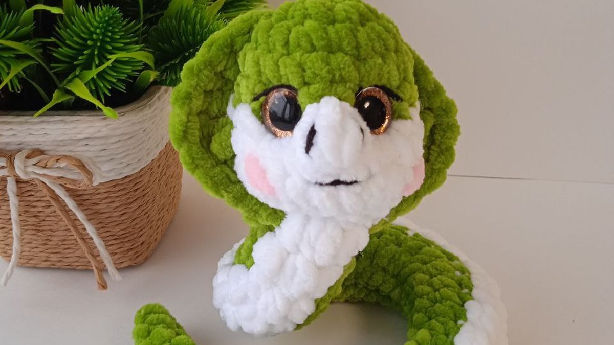 На фотографии изображена очаровательная вязаная игрушка в виде змеи. Она выполнена из плюшевой пряжи, что придаёт ей мягкость и текстуру, приятную на ощупь. Зеленый и белый цвета отлично сочетаются, придавая игрушке реалистичный и одновременно милый вид. Присутствие растений в композиции добавляет снимку естественность и гармонию.