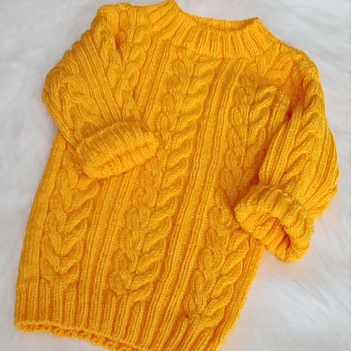 A sunny mustard sweater with pronounced cables and vertical rib lanes that looks truly cozy and "expensive." The relief braids are knitted evenly, the pattern reads well, cuffs and hem are neatly finished in ribbing, and the sleeves appear softly gathered. The model is classic but very wearable: such texture can easily "elevate" even a plain piece and make it a wardrobe focal point.