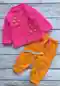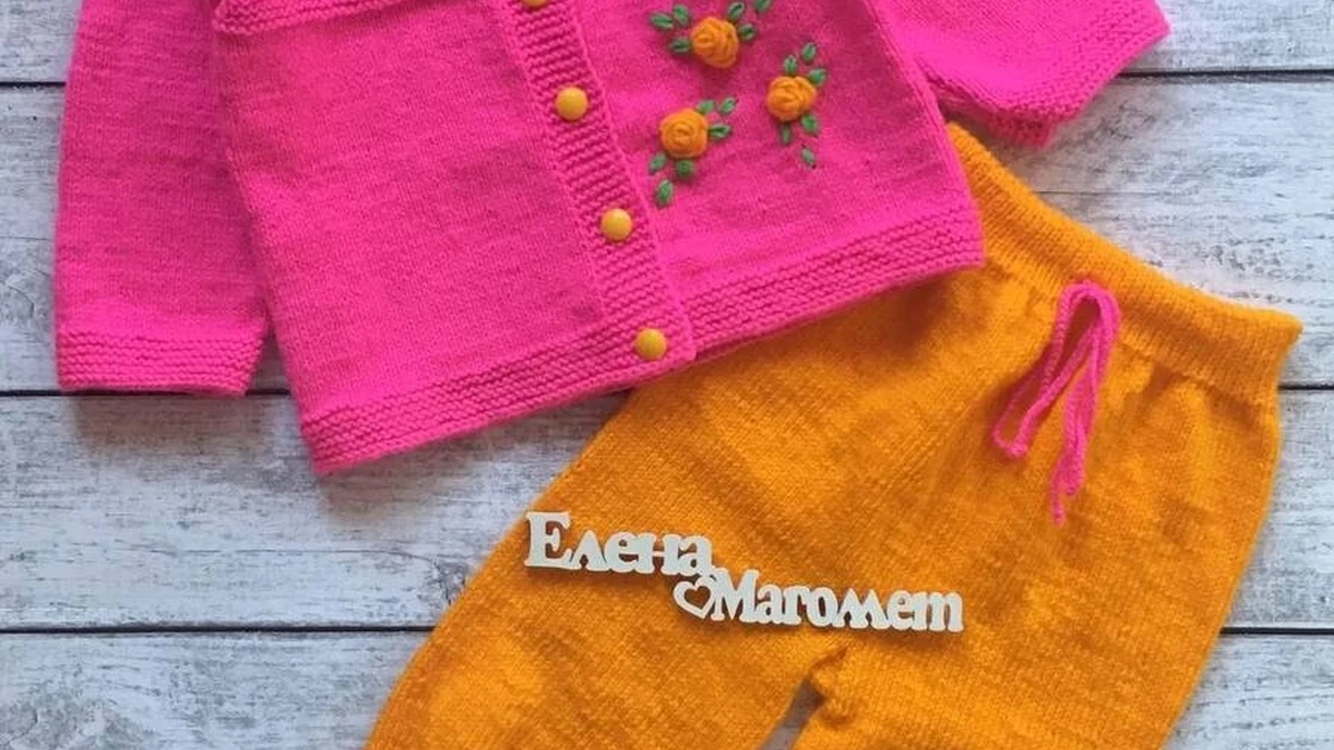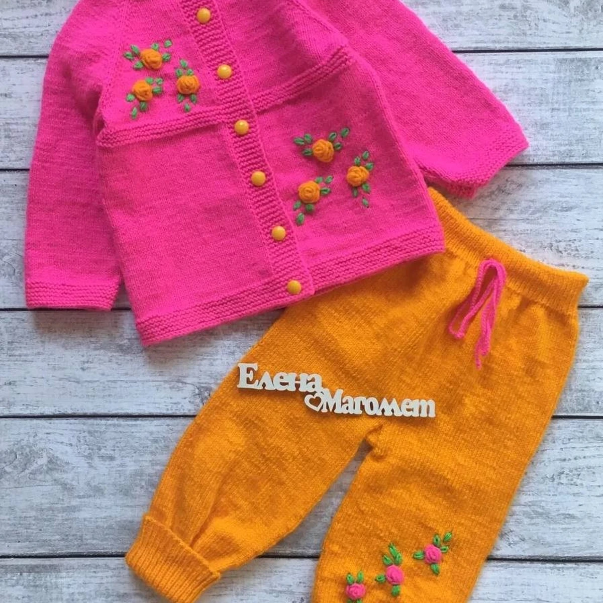 A bright children's set with character: a raspberry cardigan with buttons and mustard pants create a striking, “tasty” duet. The main fabric is worked in stockinette stitch, while neat bands and hems are finished in garter stitch/denser edging to hold shape and add polish. Decoration in the form of dimensional flowers and leaves enlivens the piece and makes it truly original. Overall the work looks tidy and wearable: good proportions, pleasant details, successful presentation on a neutral background.