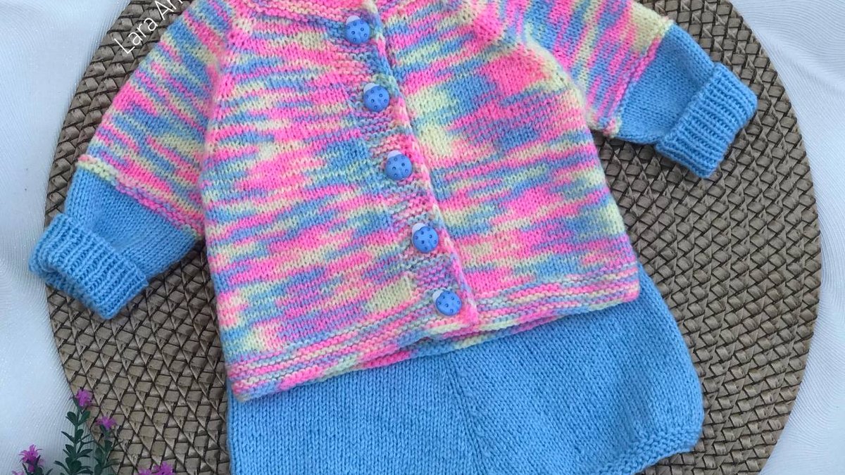 Этот очаровательный комплект для малыша состоит из жакета и шортиков, связанных из акриловой пряжи с радужной расцветкой. Яркие переплетения розового, голубого и желтого создают веселый и неповторимый узор, радующий глаз. Жакет украшен симпатичными пуговицами и имеет аккуратные манжеты, гармонично сочетающиеся с шортиками. Комплект выглядит уютно и нежно, идеально подходит для прогулок в прохладное время года.
