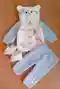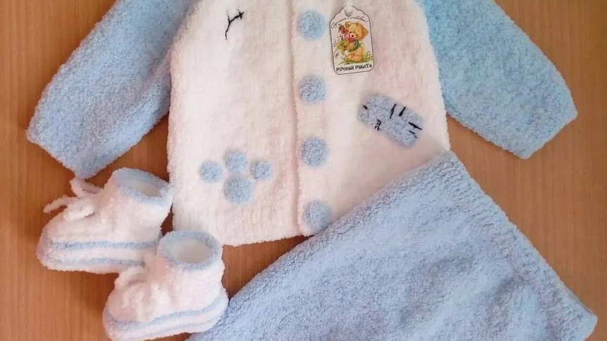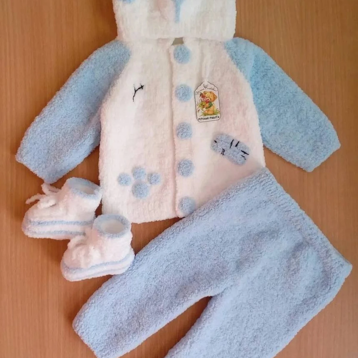 A gentle plush set for a baby in a white-and‑blue palette — warm, “cloud-like” and very tactile. The jacket with a bear-hood and a neat little face looks sweet and tidy; pompom “buttons” add decorative detail. The trousers have an even fit, the booties match the overall style, and the small paw appliqués make the set cohesive. Overall the work gives the impression of a neat, shop-quality outfit, with a pleasant idea for a newborn gift.