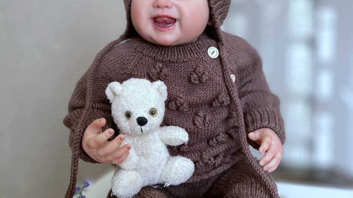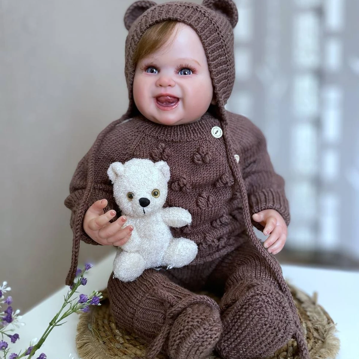 A warm "bear" set in a chocolate shade — a romper with closed legs and a cozy bonnet with ears. The texture is maintained by ribbing and raised elements, and the yoke is decorated with neat "bobble" stitches that add volume without weighing it down. The fit looks well thought-out: cuffs and edge trims are even, the button placket is clean, and the bonnet ties are neatly finished. A white plush teddy in the photo nicely reinforces the theme and emphasizes the outfit's tenderness.