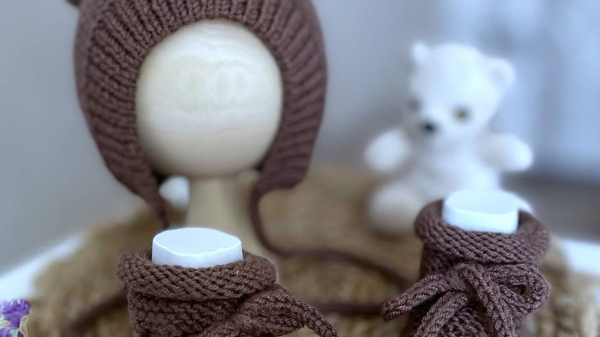 A warm “bear” set for a baby — a bonnet with neat little ears and booties with ties. The elastic at the bonnet ensures a good fit, the edges look tidy, and the booties are knit densely so they won’t let drafts in. The knitting overall is very even: stitches are uniform in size, without obvious gaps or distortion. The idea is popular, but the execution is clean and “shop-quality,” and the soft lighting and calm background in the presentation add a premium feel.