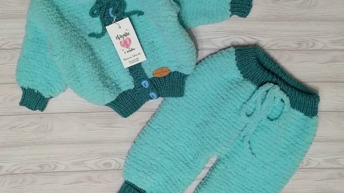 Очаровательный комплект для малыша – уютная плюшевая курточка-бомбер и свободные штанишки-джоггеры в нежном мятном цвете с контрастными тёмно-бирюзовыми резинками. Объёмная фактура пряжи «травка» создаёт облачко-мягкость, а плотные эластичные манжеты надёжно держат тепло и не дают продуваться. Курточка дополнена декоративным шнурком-бантиком, аккуратной планкой на пуговицах и фирменной кожаной нашивкой, что придает изделию авторский штрих. Штанишки имеют комфортный пояс со шнурком на утяжку и слегка зауженные к низу штанины – малышу будет удобно ползать и делать первые шаги. Аккуратная, ровная плотность полотна демонстрирует уверенное владение техникой.