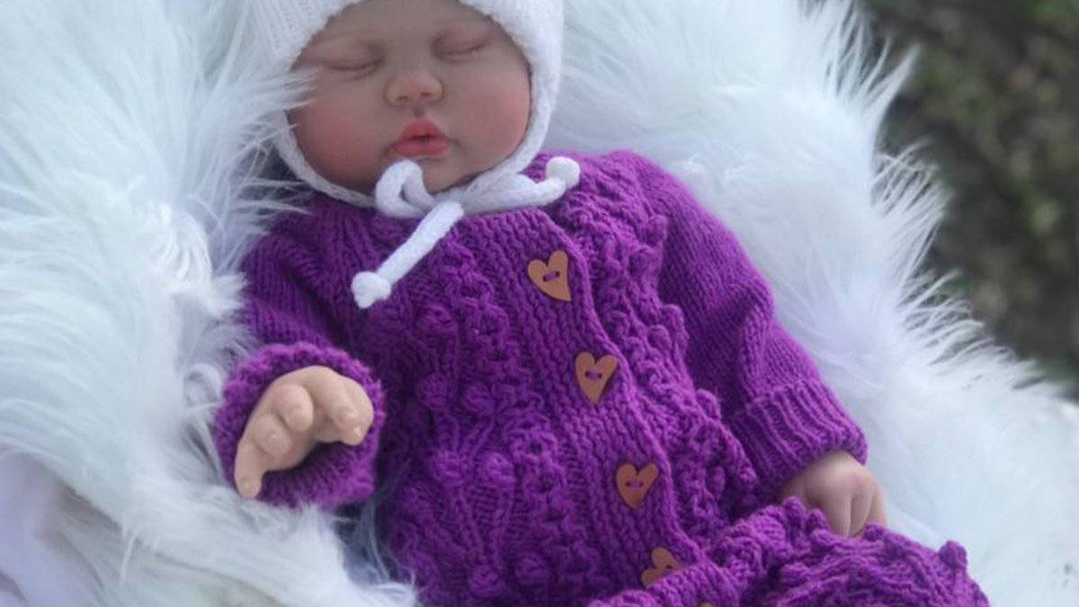 На фото изображён милый вязаный комплект для младенца, состоящий из шапочки с помпоном и тёплого комбинезона. Цвет глубокого фиолетового оттенка, и украшен деревянными пуговицами в форме сердечек. Комплект не только согреет, но и станет стильным акцентом в гардеробе малыша.