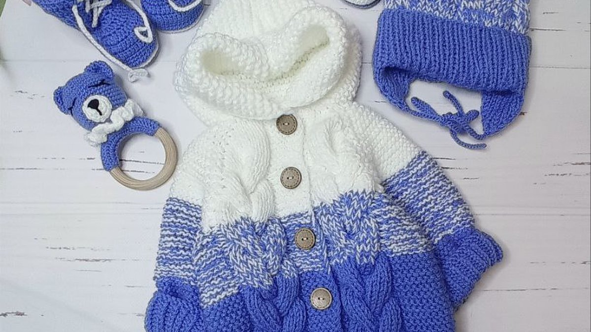 Очаровательный комплект для малыша в мягкой бело-васильковой гамме: уютный комбинезон с капюшоном и фактурными косами, шапочка с огромным меховым помпоном и завязками, теплые пинетки-кроссовки с шнуровкой, классические ботиночки-носочки, мини-снуд и погремушка-грызунок с мишкой. Контраст цвета подчёркивает плавный переход меланжевой полосы, а крупные деревянные пуговицы добавляют тепла и эко-шарма. В разных деталях играют жемчужная вязка, резинка и выразительные аранские жгуты, создавая интересную текстуру и плотность без лишней тяжести.