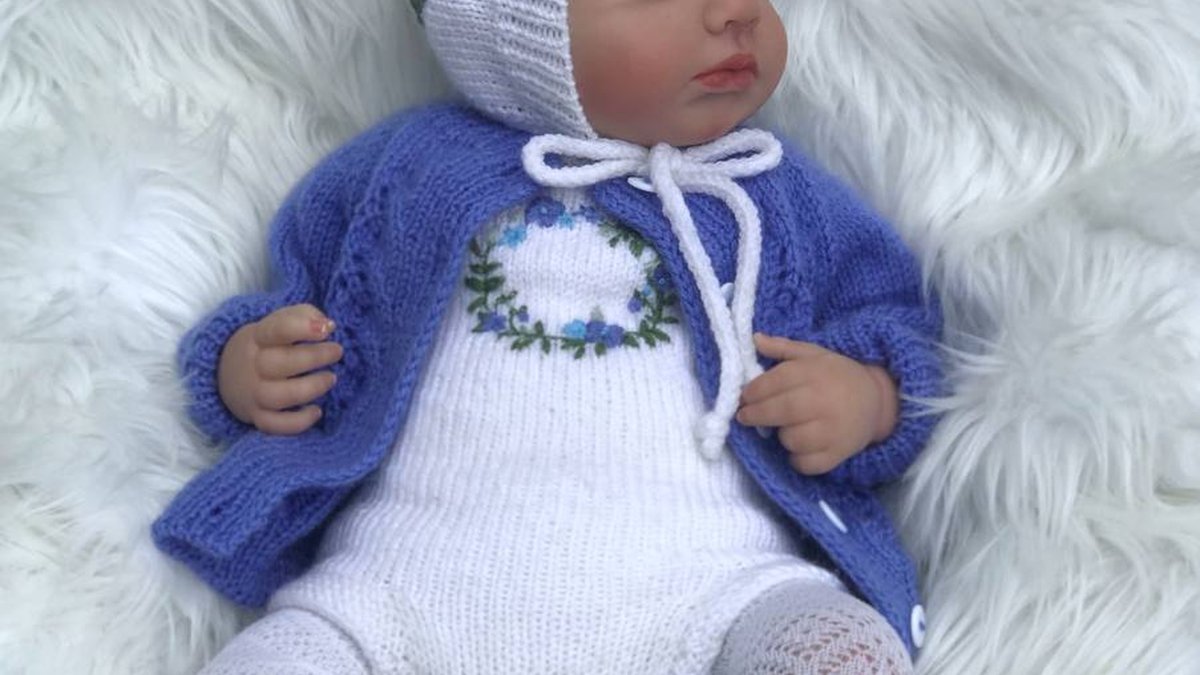 Очаровательный комплект для новорождённого будто соткан из нежности: белый бодик-комбинезон плотной лицевой гладью оформлен веночком из вышитых васильков, создавая акцент на груди. Мягкая шапочка-эльф с ушками продолжает тему: сбоку расцветают миниатюрные вышитые веточки, а упругий резиновый край надёжно прилегает к головке. Кардиган небесно-василькового оттенка связан лицевой гладью с ажурными вставками по планке рукава, дополнен кокетливой фактурной резинкой и застёжкой на маленькие пуговки. Пинетки-чулочки объединяют белое полотно с васильковыми оборками, поддерживая цветовую гармонию. Комбинация гладкой и ажурной вязки придаёт комплекту и нарядность, и практичность, а воздушная пряжа подчёркивает детскую хрупкость и уют.
