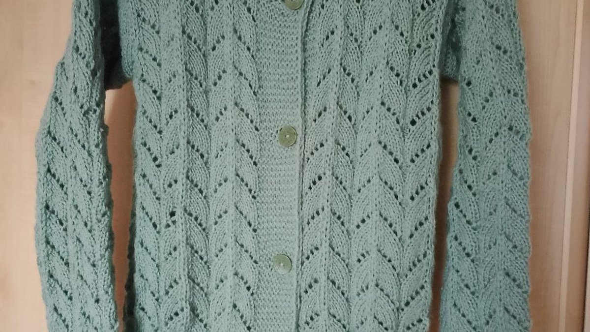 Уютный удлинённый кардиган нежно-салатового оттенка связан из пряжи среднего метража ажурным V-образным узором «ёлочка». Чёткие дорожки накидов и убавок создают изящные листики, которые придают полотну лёгкость, а плотная планка платочной вязкой с крупными пуговицами добавляет структурную строгость. Ровные, практически безупречные кромки, аккуратный вырез горловины и цельновязанные рукава подчёркивают высокий уровень мастерства. Кардиган смотрится воздушным, но при этом тёплым – идеальный спутник прохладной весны или ранней осени.