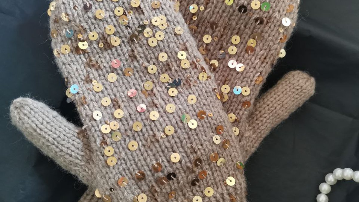 Варежки выполнены классическим круговым вязанием на пяти чулочных спицах 3,5 мм, что обеспечивает отсутствие швов и максимальную эластичность полотна. Для манжеты использована резинка 1×1, связанная на спицах 3 мм, чтобы край был плотнее и лучше облегал запястье. Основное полотно выполнено лицевой гладью — это даёт ровную, чуть бархатистую поверхность, идеально подходящую для вышивки пайетками. После набора 40 петель итальянским способом провязано 18 рядов резинки, затем переход на основное полотно, прибавив 4 петли для свободы. Большой палец вывязан методом «afterthought thumb»: петли были сняты на вспомогательную нить, затем вернулись в работу, что позволило не нарушать текстуру лицевой глади. Пайетки пришиты вручную шелковой нитью после блокировки изделия. Мастер распределял их неравномерно: более плотная вышивка на тыльной стороне ладони создаёт эффект «сверкающей перчатки», а на ладонной стороне пайеток меньше, чтобы не мешать хвату. Для фиксации пайеток использован приём «стежок-якорь» — нить проходит через центр диска дважды, предотвращая провисание. Убавки на макушке варежки выполнены клиньями с симметричными ssk и k2tog, что формирует аккуратный анатомический силуэт. По завершении работа была отпарена через влажную ткань, чтобы выровнять петли и придать пайеткам лёгкий наклон вперёд, усиливающий их сияние.