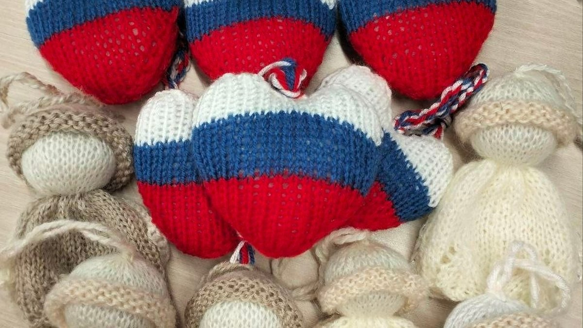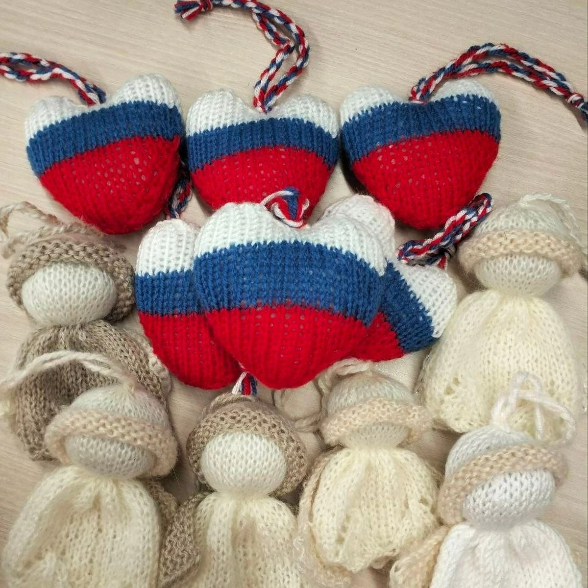 Knitting (on needles): small three-dimensional pendants (hearts and angels), worked mainly in stockinette stitch with increases/decreases and subsequent seaming/stuffing.