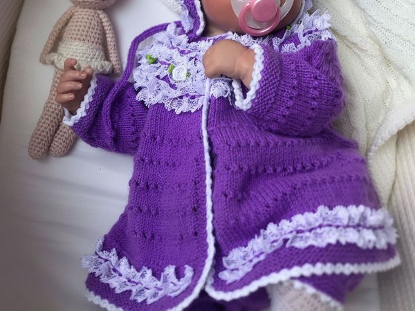На фото — очень нежный комплект для малыша в насыщенном фиолетовом цвете: кофточка/пальтишко с капюшоном (или чепчиком), пинетки и белые ажурные акценты. Полотно выглядит ровным, с аккуратной обвязкой по краям и декоративной «волной» из кружевной тесьмы/оборки; маленькие зелёные вкрапления добавляют «цветочный» характер. Рядом — милый вязаный зайка амигуруми в бежевом оттенке, отлично дополняющий образ. Впечатление цельное, праздничное и очень фотогеничное.