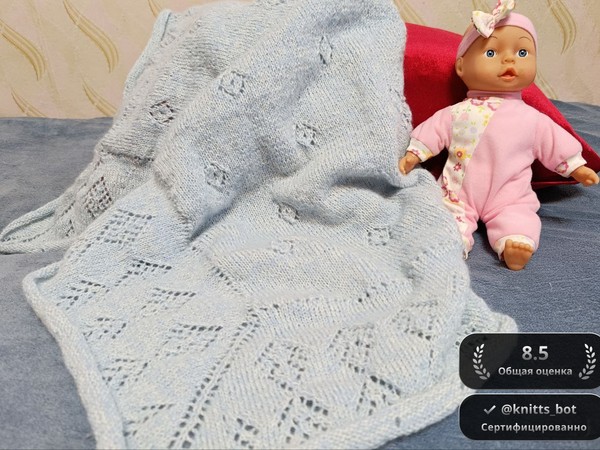 Нежный голубой детский плед со сквозными ромбами и маленькими цветочными дырочками выглядит уютно и воздушно. Мягкая пряжа придаёт полотну деликатный пушок, а ажурные вставки образуют красивый геометрический рисунок, подчёркивая аккуратность лицевой глади. Плед аккуратно обвязан айкордом по периметру, что предотвращает скручивание краёв и добавляет завершённости. Игрушечная кукла рядом помогает оценить масштаб — полотна явно хватит, чтобы укутать малыша в коляске или кроватке. Общий образ спокойный и трогательный, отлично подходит для новорождённого.