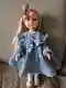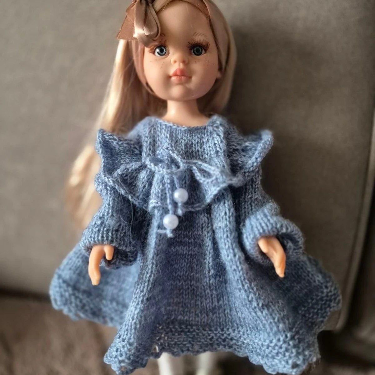 Нежный кукольный образ в припылённо-голубой гамме: вязаное платье-пальтишко с пышной оборкой у горловины и аккуратными рукавами выглядит по-настоящему «по-взрослому». Силуэт хорошо держит форму, низ красиво расклёшен, а застёжка/декор с бусинами добавляет нарядности. Полотно в целом ровное, но местами заметна лёгкая пушистость и небольшие перепады натяжения, из-за чего край и оборка читаются чуть менее чётко. Фотография мягкая, атмосферная, удачно подчёркивает фактуру.