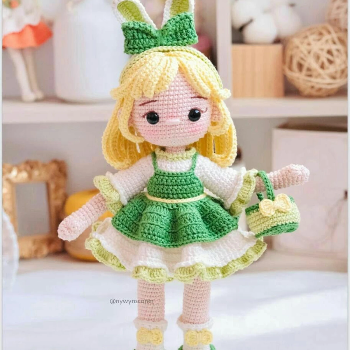 Нежная амигуруми-куколка в «лаймовом» образе с ушками зайки — очень цельная и профессионально собранная работа. Полотно связано ровно, с хорошей плотностью: форма головы и конечностей аккуратная, без провалов и «ступенек». Наряд продуман до мелочей: сарафан с пышной юбкой и оборками, туфельки, носочки, мини-сумочка — всё в единой стилистике. Цветовая палитра свежая (зелёный/белый/жёлтый + телесный), лицо выразительное за счёт удачной посадки глаз и мягких линий вышивки.