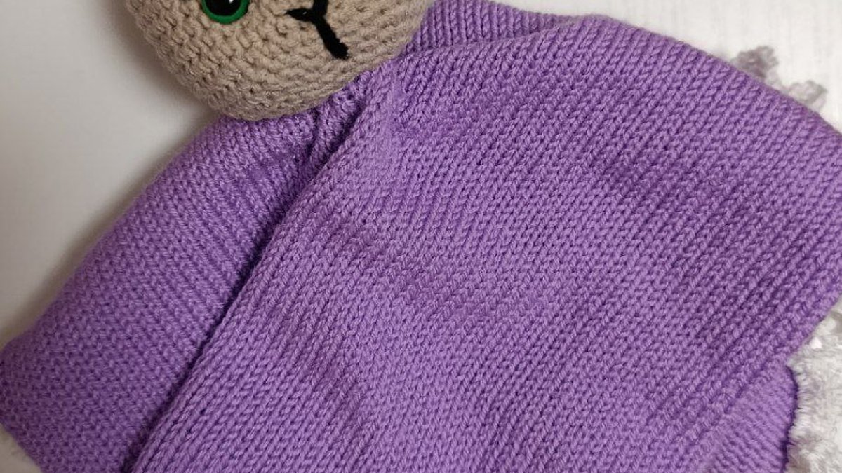 На фото очаровательная игрушка-комфортер: зайка с вязаным (спицами) фиолетовым «платьицем/тельцем» и крючковой головой в стиле амигуруми. Лицевая гладь смотрится ровно и аккуратно, форма полотна хорошая, а белая кружевная обвязка по краю добавляет нежности и «кукольности». Мордочка оформлена вышивкой, глазки — безопасные с зелёным ободком; сверху милый бантик. Образ очень цельный: спокойный беж + лаванда — удачное сочетание для детской темы.