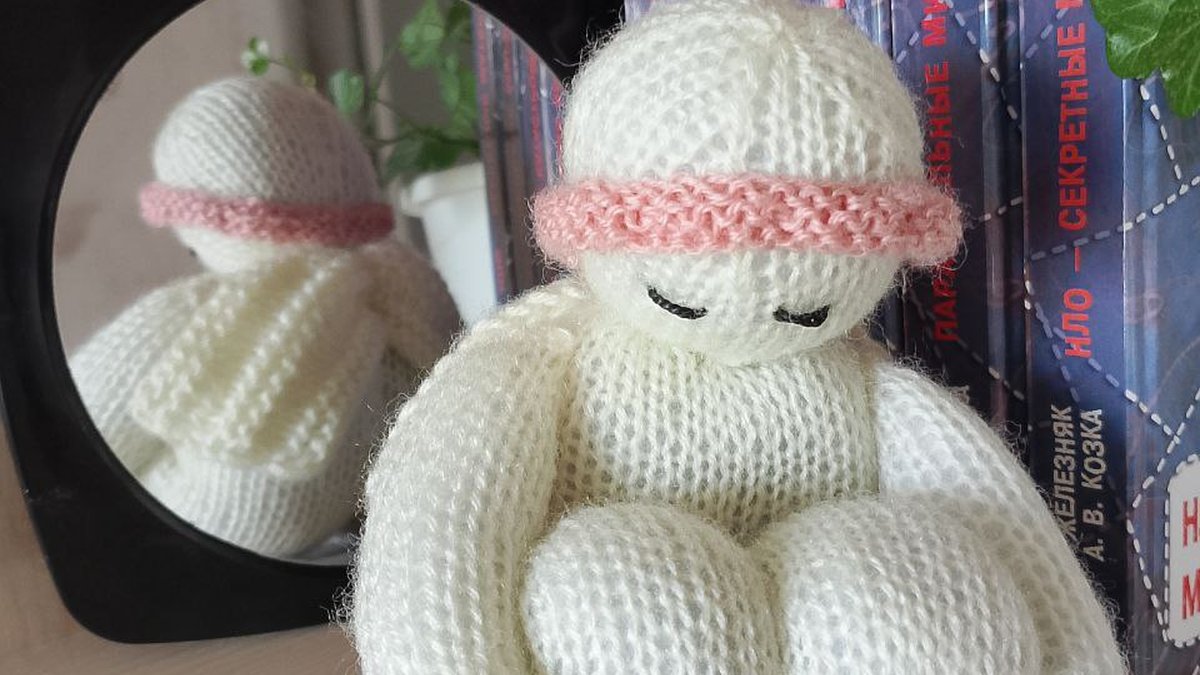 Очаровательная вязаная кукла-скульптура словно сидит в позе лотоса, обхватив пухлые коленки длинными мягкими ручками. Молочно-белая пряжа с лёгким пушком создаёт ощущение облачности и нежности, а розовая фактурная повязка на голове добавляет милый акцент. Чётко сформированные шарообразные формы ножек и ручек демонстрируют аккуратную вязку лицевой гладью, благодаря которой поверхность получается ровной и упругой. Закрытые вышитые глазки придают игрушке умиротворённое, медитативное выражение. В целом работа производит впечатление минималистичной и очень уютной декоративной фигурки, идеально подходящей для подарка или домашнего декора.