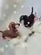 Очаровательная пара такс амигуруми — одна шоколадная, другая угольно‑чёрная, с контрастными мордочками и лапками. Полотно плотное, хорошо держит форму, силуэты узнаваемые: вытянутое туловище, аккуратные ушки, хвост «трубочкой». Глазки посажены ровно, вышивка минимальная и уместная, декоративные подвески добавляют «характер». В целом работа выглядит аккуратной и вполне товарной — видно уверенную руку и понимание пропорций.