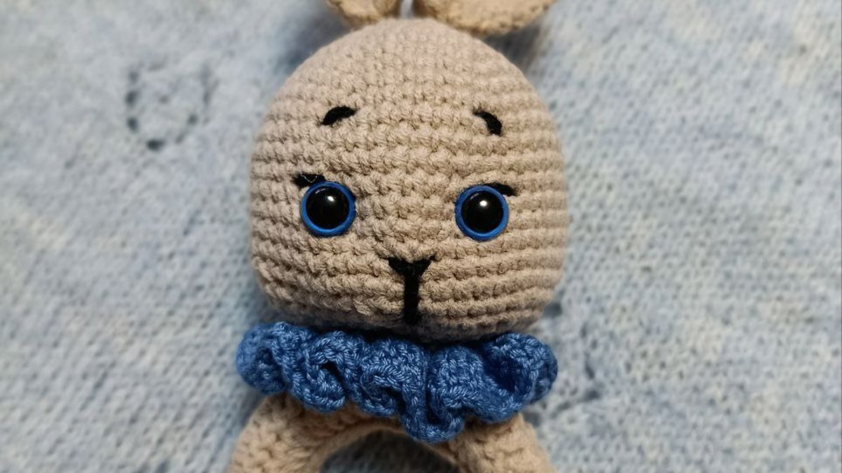 Очаровательная вязаная погремушка-прорезыватель в виде кролика: аккуратно сформированная бежевая головка с выразительными синими глазками, вышитыми бровками и носиком. Длинные подвижные ушки добавляют мимики, а волнистый синий жабо подчёркивает контраст и придаёт игрушке праздничность. Ручка выполнена на деревянном кольце, надёжно обвязанном тем же хлопком, чтобы малышу было приятно держать. Столбики ровные, плотные, без просветов – видно уверенное владение крючком и заботу о безопасности ребёнка.