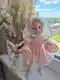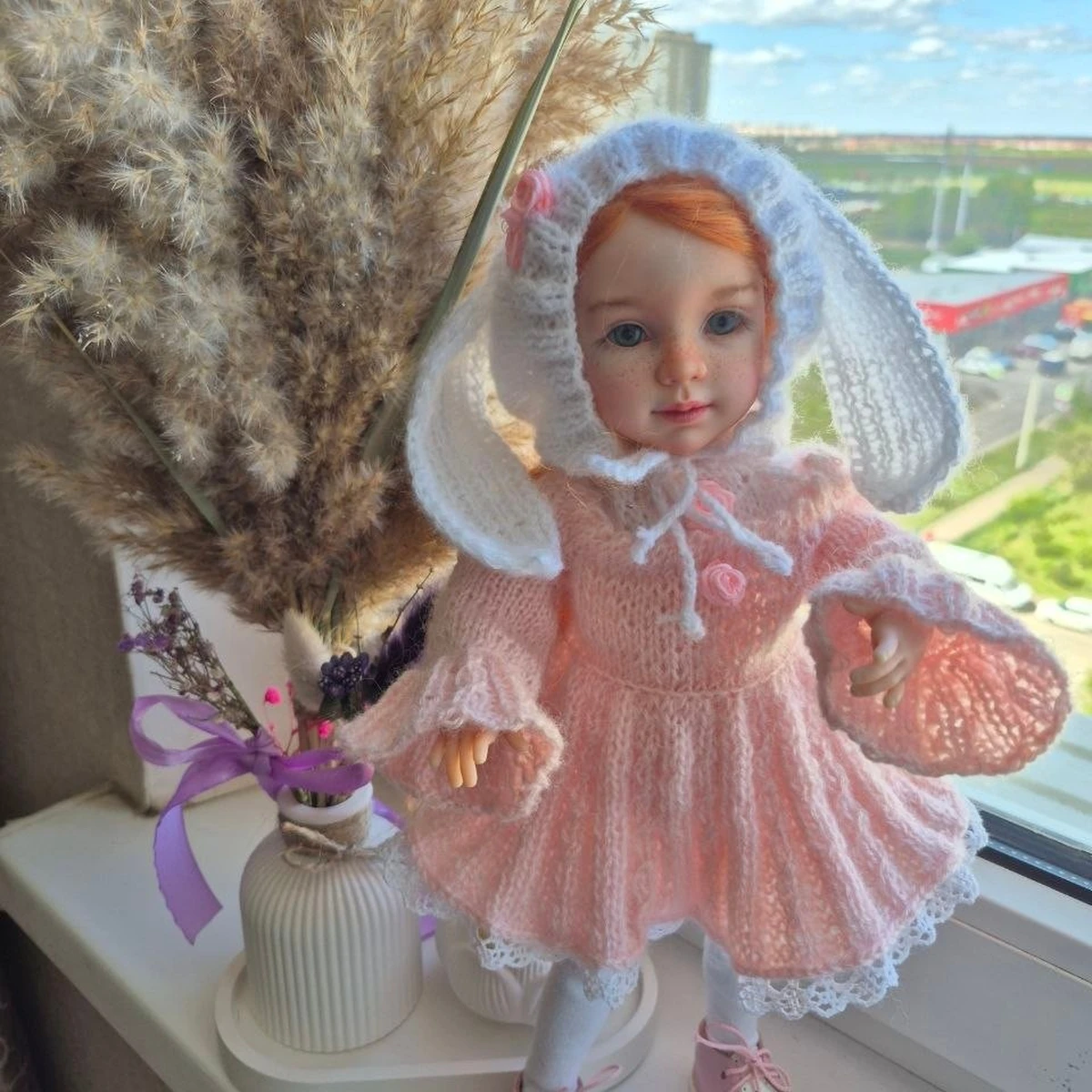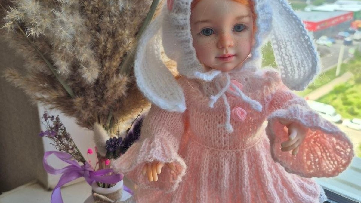 Нежный кукольный комплект в пудрово‑розовой гамме: воздушное платье из пушистой пряжи с расклёшенной юбочкой и аккуратными манжетами, плюс капор‑«зайка» с длинными ушками. Фактура мягкая, "облачная", силуэт читается отлично — вещь выглядит по‑настоящему авторской и коллекционной. Отделка по низу и краям добавляет изящества, а спокойный розовый с молочным создаёт очень гармоничный, «зефирный» образ.
