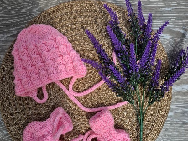 На фото — нежный детский комплект: розовая вязаная шапочка-«чепчик» с завязками и пара пинеток на шнурочках. Шапочка выполнена рельефным узором (похоже на «плетёнку/вафельку»), за счёт чего смотрится объёмно и уютно; по краю аккуратная обвязка/планка. Пинетки связаны платочной/рельефной фактурой, мягкие, «пухлые», с завязками для фиксации на ножке. Цвет — тёплый, карамельно-розовый, очень «малышовый», а лаванда в кадре красиво подчёркивает нежность комплекта.