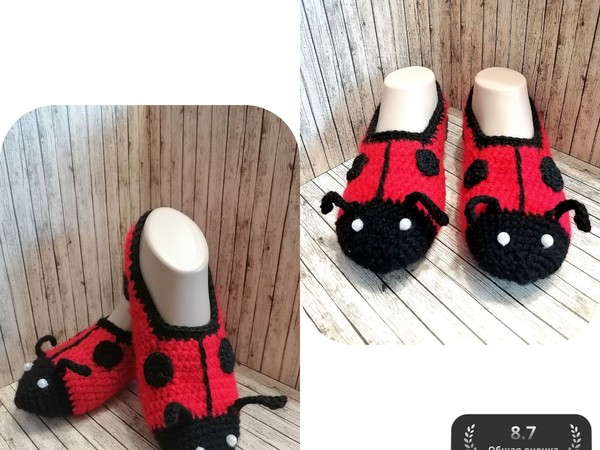 Очаровательная пара вязаных тапочек-балеток в образе божьих коровок: ярко-красный «панцирь» щедро усыпан крупными чёрными пятнышками, отделка носка глубоко-чёрным «головкой» с белыми глазками-пуговками и гибкими усиками. Контрастная чёрная кайма подчёркивает линию выреза, а мягкая плюшевая пряжа создаёт объёмную фактуру и обещает уютное тепло. Силуэт аккуратный, пятка ровная, подошва плотная — видно, что автор тщательно выверял размер и посадку. Весёлый, жизнерадостный аксессуар, который поднимает настроение с первого взгляда.
