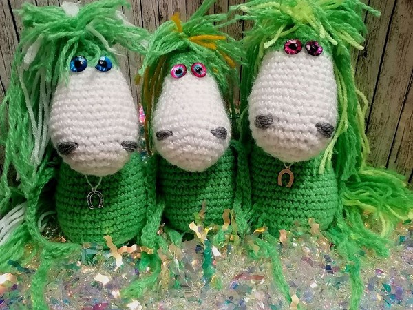 Три забавных пони-амигуруми выстроились в ряд, словно зелёная кавалерия из сказочного леса. Корпуса связаны ровными столбиками без накида, а вытянутые мордочки выполнены белой нитью, что создаёт милый контраст. Пышные гривы из пряжевой бахромы разных оттенков лайма придают игрушкам характер и объём, а крупные глиттер-глазки добавляют искристого озорства. Дополняют образ мини-подковки на грудке и радужная «лужица» конфетти у копыт, создавая праздничное настроение и подчёркивая позитивную энергию работы.