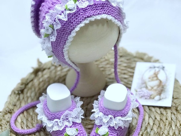 На фото — очаровательный комплект для малышки: чепчик и пинетки в нежной лавандовой гамме. Полотно связано очень ровно, с аккуратной плотностью и чистой кромкой; особенно хорошо смотрится фактурная вязка (похожа на платочную/рисовую), которая держит форму и выглядит «дорого». Отделка — белая ажурная тесьма-оборка и маленькие розочки с зелёными листочками — добавляет образу праздничности, но не перегружает. Завязки у чепчика длинные и мягкие, пинетки с контрастной белой окантовкой смотрятся завершённо. Композиция кадра уютная, хотя свет чуть пересвечивает фон и «съедает» объём.