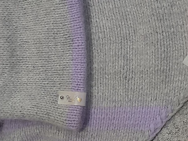 На фото уютный вязаный комплект: шапка и шарф (или снуд), выполненные спицами лицевой гладью с аккуратными полосами колор-блок в светло‑сером и нежной лаванде. Полотно выглядит мягким и ровным, переходы цвета спокойные и «дорогие» по настроению. Видно, что изделие доведено до готового состояния: есть нашивка/лейбл, края смотрятся аккуратно и носибельно. Очень приятный, повседневный сет на прохладную погоду — лаконичный, но не скучный.