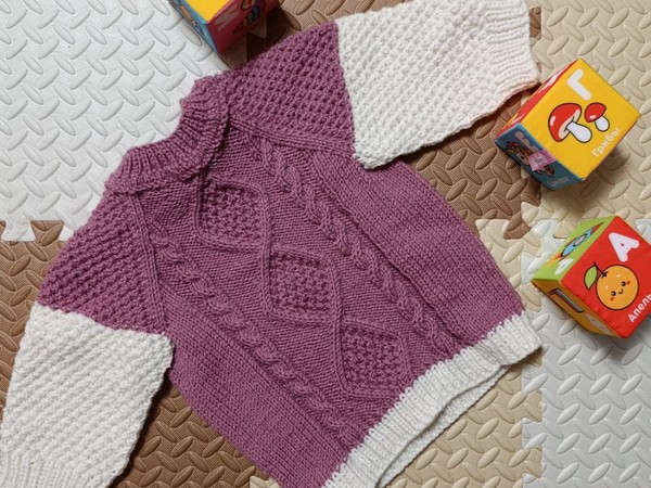 Очаровательный детский свитер-реглан выполнен в нежной пыльно-сиреневой гамме с контрастными молочными вставками на манжетах, нижней планке и половине рукавов. Центральную панель украшают крупные ромбы с «рисовой» начинкой, обрамлённые аккуратными косами 4х4. Верхняя часть и верх рукавов связаны фактурной «пчёлкой», что добавляет объёма и мягкости. Петельки ровные, переходы между узорами чистые, резинки эластичные и плотные – изделие выглядит очень аккуратно и профессионально.
