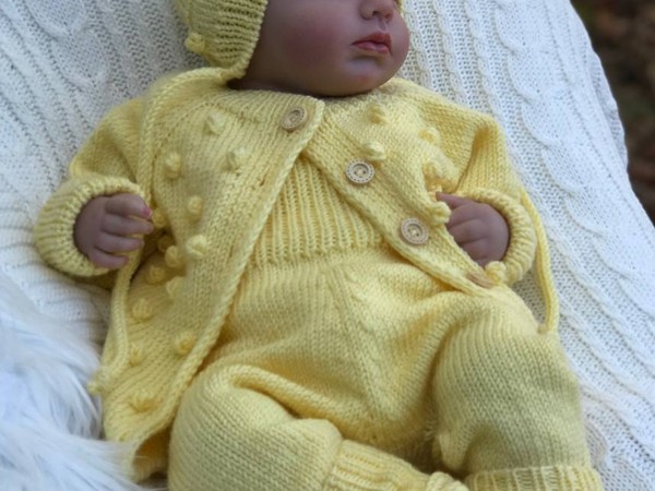 Нежнейший детский комплект в лимонно-жёлтом тоне состоит из шапочки с шишечками, кардигана на деревянных пуговках, полукомбинезона с завышенной талией и крошечных пинеток-чешек с бантиками. Аккуратная лицевая гладь выглядит ровной, шишечки одинакового размера придают объём и игривость, манжеты и планки оформлены резинкой 1×1, создавая комфортную посадку. Вся работа выполнена из одной партии мягкой полушерстяной пряжи, благодаря чему оттенок идеален по всему комплекту. Тёплый, уютный и очень фотогеничный наряд для малыша!