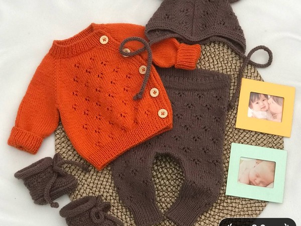 Очаровательный детский комплект из четырёх предметов: яркий тыквенно-оранжевый реглан на пуговицах, шоколадные штанишки с ластовицей, шапочка с ушками и мягкие пинетки-чешки. Все детали объединяет аккуратный ажурный рисунок «дырок» в шахматном порядке, который добавляет лёгкости полотну и визуально связывает разноцветные элементы в единый образ. Плавные регланные линии, ровные убавки на манжетах и идеально пришитые деревянные пуговки подчёркивают высокий уровень исполнения. Контраст тёплого оранжа и землистого коричневого выглядит по-осеннему уютно и стильно, а нежная пряжа средней толщины делает комплект практичным и комфортным для малыша.