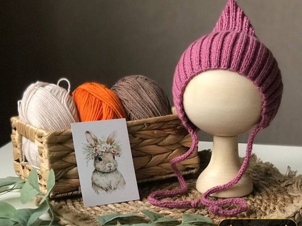 Шапочка связана круговыми спицами №3,0 из полушерсти методом вязания по кругу без шва. Набор петель выполнен классическим крестообразным способом, после чего сразу идет резинка 2×2, позволяющая полотну плотно облегать голову и сохранять эластичность. Через 11 см полотна начинаются последовательные убавки: каждые четыре дорожки лицевых петель соединяются протяжкой, формируя аккуратные клины. Такое равномерное распределение убавок создаёт характерный заострённый «эльфийский» силуэт. Кромочные петли провязаны лицевыми для последующего аккуратного подъёма i-cord: из бокового края поднято по 3 петли на каждые 4 ряда, что обеспечивает ровный, непрерывный кантик. I-cord завязки вяжутся длиной около 28 см каждой, закрытие петель — методом трёх спиц для гладкой стыковки с основным полотном. Завершающий этап — влажно-тепловая обработка паром и лёгкая блокировка на деревянной болванке; это фиксирует форму пика и выравнивает резинку без потери объёма. Выбранная пряжа средней крутки позволяет добиться чёткой выраженности рельефа резинки, а высокое содержание мериносовой шерсти добавляет тепло, мягкость и упругость. Благодаря простой, но безукоризненной технике, изделие подходит как для повседневной носки, так и для фотосессий новорождённых.