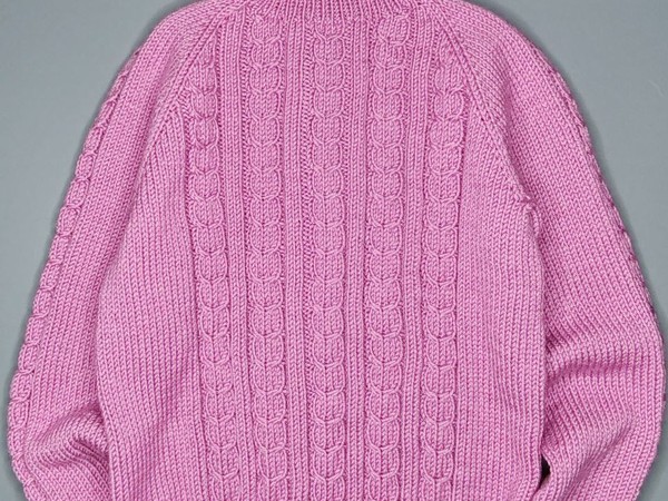 На фото — аккуратный вязаный свитер-водолазка насыщенного пыльно-розового оттенка. Посадка выглядит продуманной: плавные регланные линии, высокий воротник-гольф с подворотом и широкая резинка по низу и манжетам создают «магазинный» силуэт. Центральная часть украшена вертикальными жгутами/косами, которые вытягивают фигуру и добавляют фактуры; по рукавам тоже видны рельефные дорожки. Полотно ровное, петли стабильные, изделие смотрится тёплым и очень носибельным — отличный базовый акцент в гардеробе.