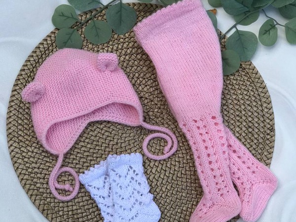 Очаровательный комплект для малышки: нежно-розовая шапочка-«мишутка» на завязках, высокие ажурные гольфики в тон и белоснежные кружевные носочки. Шапочка связана платочной вязкой, мягко облегает головку, а крошечные ушки добавляют милый характер. Гольфики выполнены чулочной гладью с романтичными ажурными дорожками, подчёркивающими длину детских ножек. Белые носочки изящно перекликаются с рисунком гольфов, образуя воздушное кружево. Гармоничные пастельные цвета и аккуратная плотность петель подчёркивают бережную работу мастера.