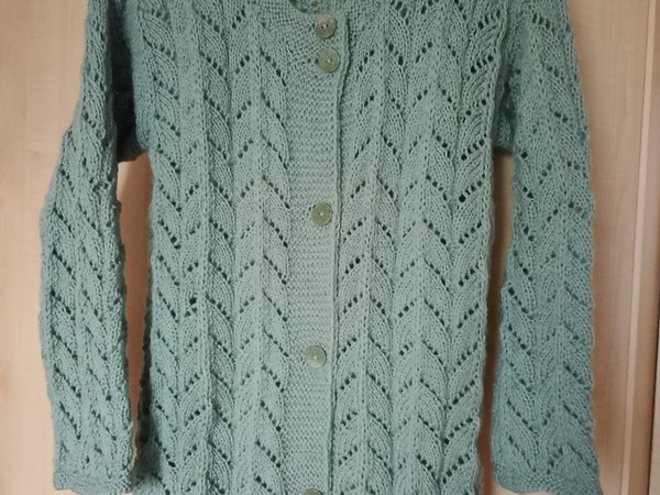 Перед нами изящный удлинённый кардиган нежного мятного оттенка, связанный спицами из лёгкой полушерстяной пряжи. Основной узор – вертикальные «ёлочки»-листья с ажурными отверстиями, создающими красивый рельеф и визуально вытягивающими силуэт. Широкая планка застёжки выполнена платочной вязкой, подчёркивая аккуратные матовые пуговицы в тон. Скруглённый вырез горловины мягко обрамляет шею, а рукава повторяют узор полочек, обеспечивая гармонию рисунка по всему изделию. Длина до середины бедра делает эту вещь универсальной – её легко представить и с джинсами, и с платьем. Работа выглядит аккуратной, петли ровные, переходы узора чёткие, а выбранный цвет подчёркивает свежесть и лёгкость модели.