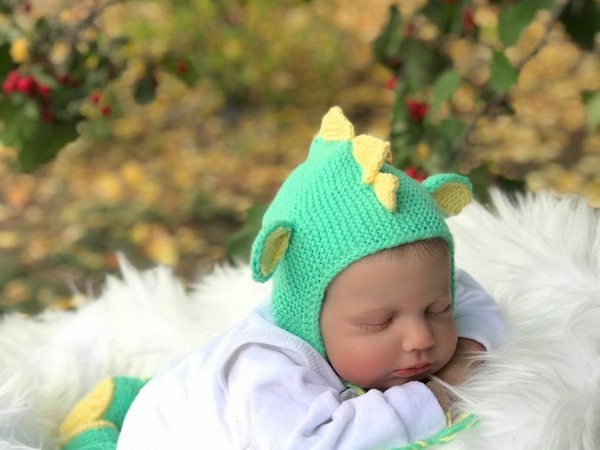 Перед нами очаровательный комплект для новорождённого в стиле «маленький динозавр»: мятно-зелёный чепчик-капор с ушками и зубчиками, дополненный хвостиком той же расцветки. Плотная платочная вязка создаёт упругую текстуру и отлично держит форму, а мягкая детская пряжа бережно касается кожи. Яркие жёлтые шипы и подкладка ушек выступают приятными акцентами и делают образ по-настоящему сказочным. Идеальная модель для нежной фотосессии: малыш выглядит уютно и забавно, а контраст с пушистым белым фоном подчёркивает сочность цвета.