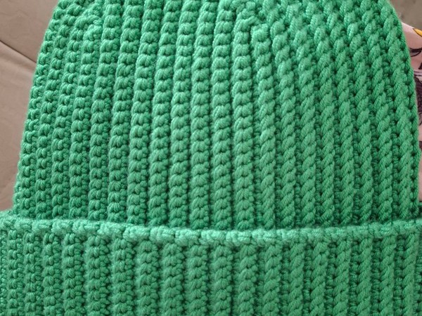 Уютная зелёная шапка-бинни выполнена плотной рубчиковой фактурой: вертикальные дорожки выглядят ровно и аккуратно, а одинаковая плотность петель создаёт гладкий, «тушки» силуэт. Сглаженные убавки на макушке собирают полотно в аккуратную звёздочку, а широкий отворот добавляет объёма и тепла. Яркий однотонный цвет напоминает сочную весеннюю мяту — он освежает и отлично подчёркивает текстуру. Фото достаточно чёткое: хорошо видны петли и структура, что позволяет оценить мастерство автора.